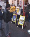 Since July 1999, Jiang's Regime has continuously persecuted Falun Dafa practitioners who steadfastly believe in the universal principles of "Truthfulness, Compassion, and Forbearance." To date, it is confirmed that over one thousand Falun Gong practitioners have died in this campaign of genocide. In addition, Jiang's regime has utilized all kinds of mass media to spread evil propaganda defaming Falun Gong to the people inside and outside of China. Many Chinese people harbor a negative impression of Falun Gong after such a poisonous influence. To provide more opportunities for Chinese people to learn the facts about Falun Gong and the Jiang regime's evil nature, European Falun Gong practitioners thus went to Chinatown.