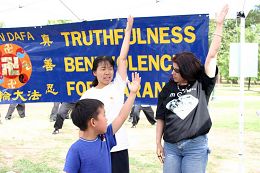 A middle-aged woman came with her teenaged son stopped by the booth. After hearing a practitioner's introduction, she said, "I am looking for a meditation practice. I would also like to have my son learn. I am interested in Falun Gong. Where can I learn?" When she heard that there was free instruction at a downtown park the next day, she said with delight, "See you tomorrow." Some visitors were eager to learn the exercises on the spot. Another middle-aged woman said, "I practiced other meditations. Today, I'd like to learn Falun Gong." She attentively learned the exercises on the spot.