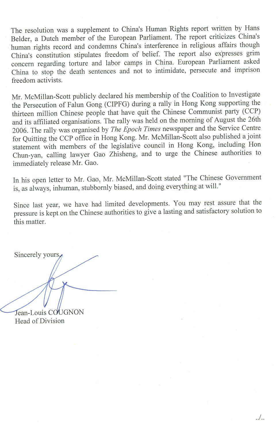 (Clearwisdom.net) On February 13, 2007, Jean-Louis COUGNON, Head of Division, European Parliament, wrote a letter to Falun Gong practitioner Bu Dongwei's wife, Mrs. Lou Hongwei, informing her that the European Parliament will continue its efforts to rescue Bu Dongwei. The letter motioned that on September 7, 2006, the European Parliament unanimously passed a resolution for a report on EU-China relations, calling on the Chinese regime to release Falun Gong practitioner Bu Dongwei. The letter says at the end: "You may rest assured that the pressure is being on the Chinese authorities to give a lasting and satisfactory solution to this matter." Below is the text of the letter.