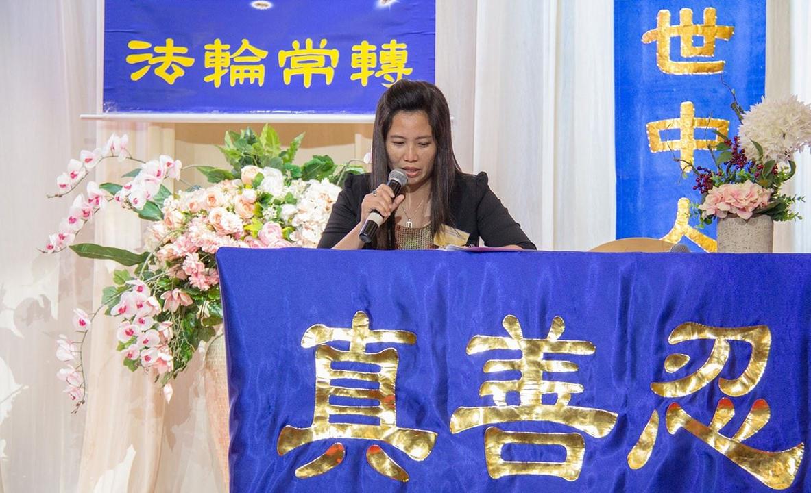 Eighteen speakers shared their stories of how they started practicing Falun Dafa, how they follow the principles of “Truthfulness-Compassion-Forbearance” in conflicts with others, and how they clarify the truth of Falun Dafa to the public.