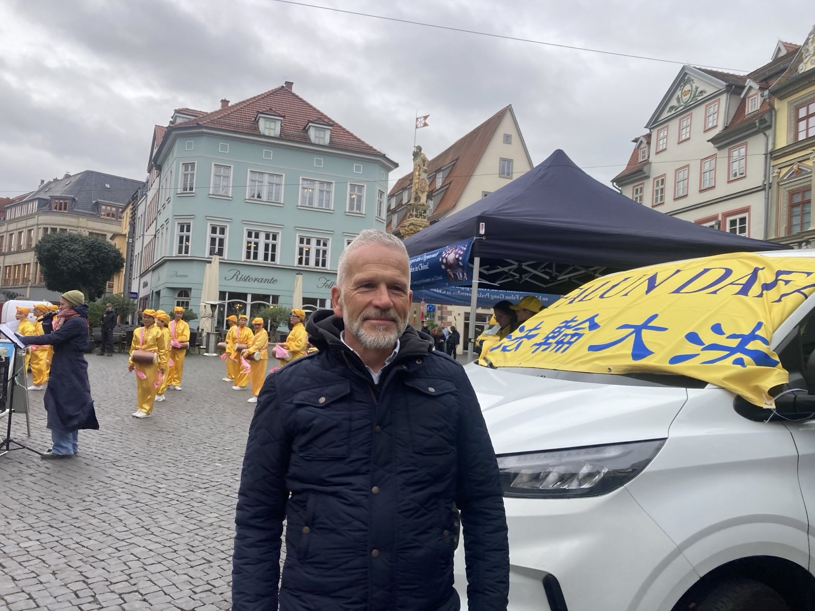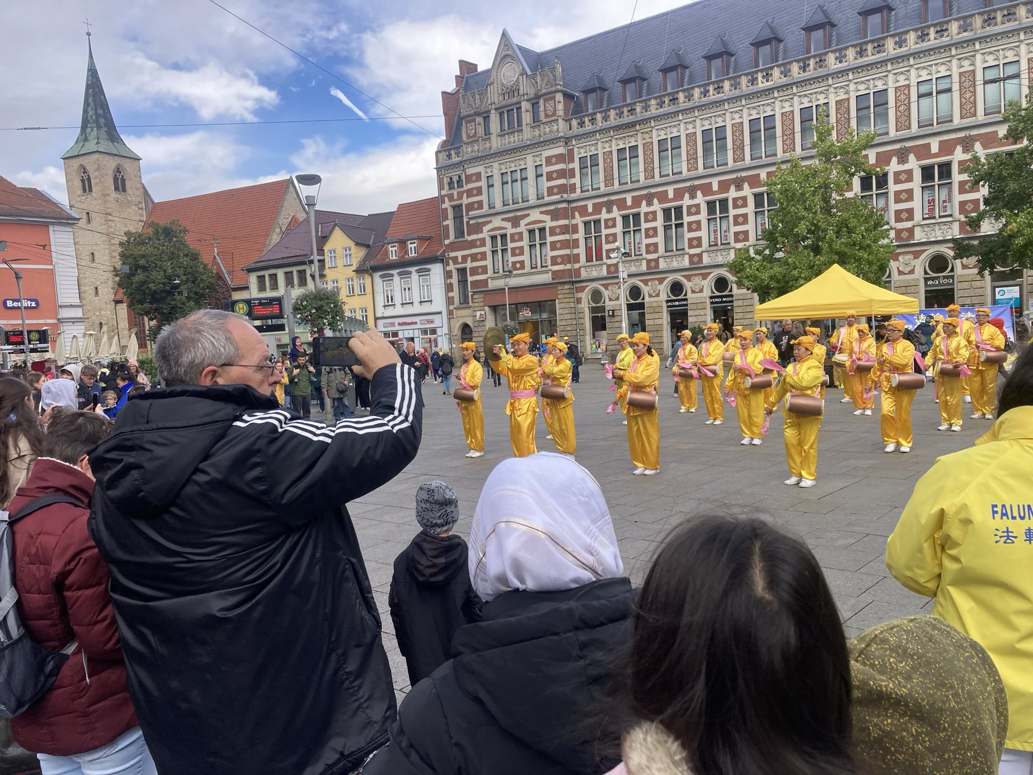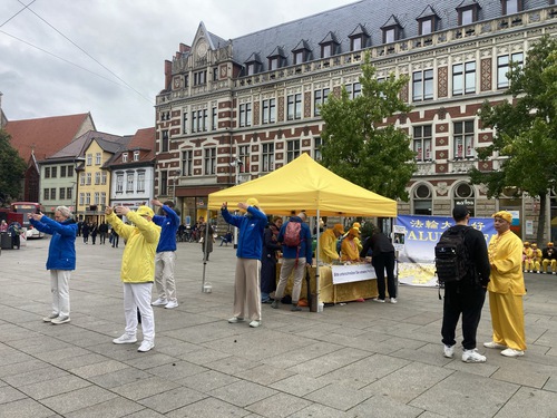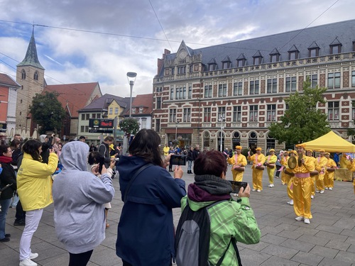 Erfurt is the capital of the German state of Thüringen. Falun Dafa practitioners set up booths at the Fischmarkt and Anger Platz, where they demonstrated the exercises, played the waist drums and gave speeches.