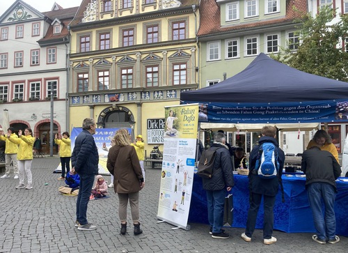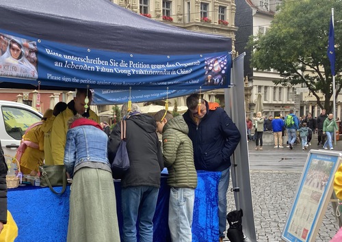 (Minghui.org) Falun Dafa practitioners from different parts of Germany held rallies in two locations in the center of Erfurt, a central city in northern Germany on October 4, 2025. They introduced Falun Dafa and told people about the Chinese Communist Party’s (CCP) ongoing persecution of practitioners in China. The event gained the attention of the local residents, and many people signed the petition as a show of support for the practitioners’ efforts to end the persecution.