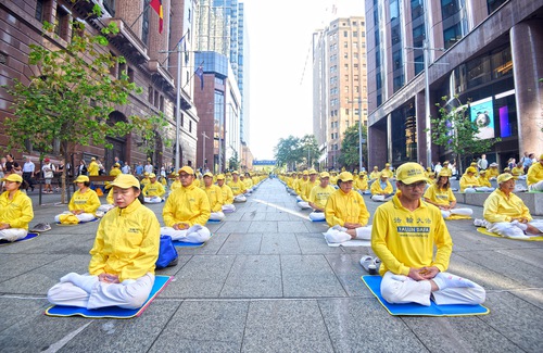 (Minghui.org) Hundreds of Falun Dafa practitioners from across Australia held a large group practice on Martin Place in Sydney’s central business district on Friday morning, October 10, 2025. The gathering marked the beginning of a three-day series of events, leading up to the 2025 Australian Falun Dafa Cultivation Experience Sharing Conference on Sunday.