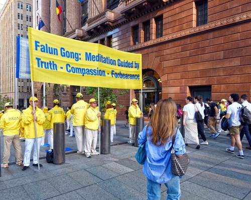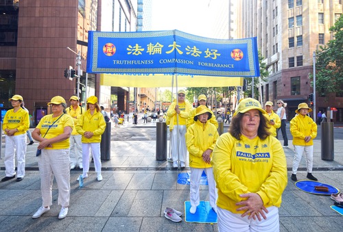 After completing the exercises, practitioners held a parade that departed from Martin Place and ended in Belmore Park. Afterwards, practitioners from different parts of Australia shared some of the amazing experiences they have had through practicing Falun Dafa (also known as Falun Gong).