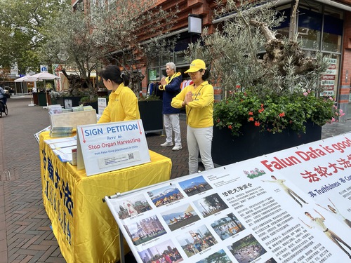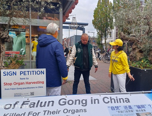 Alphen aan den rijn is a municipality in the province of Zuid Holland with approximately 120,000 residents. Practitioners set up truth-clarification display boards on Julianastraat, demonstrated the five exercises of Falun Gong, explained the persecution to the public, and collected signatures on a petition calling to end the CCP’s state-sanctioned forced organ harvesting. Several people learned the exercises on the spot.