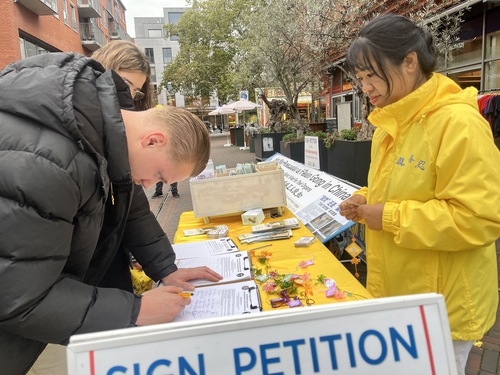 The practitioner showed him a photo of a Chinese girl in exile in Germany who had her left lung removed after being tricked by a hospital. The practitioner told the man that live organ harvesting is still happening in China and that everyone is in danger if people remain silent and turn a blind eye. The older man squeezed his eyes shut several times, seemingly trying to hold back tears. “This is shocking!” he said. He signed the petition to help stop the forced organ harvesting.