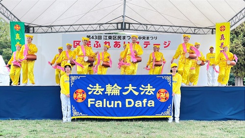 (Minghui.org) Falun Dafa practitioners participated in the Koto City Citizen’s Festival held in Metropolitan Kiba Park on October 19, 2025. Many people praised their waist-drum dance and Falun Dafa exercise demonstration.