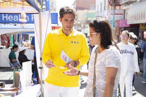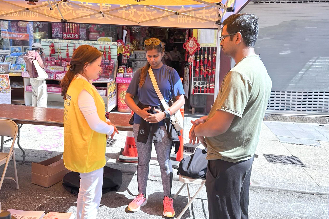 Practitioners talk with visitors about Falun Dafa and the CCP’s persecution in the Chinatown Autumn Moon Festival celebration on September 27 and 28, 2025.