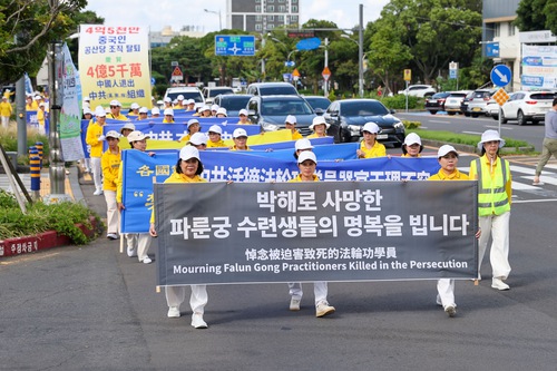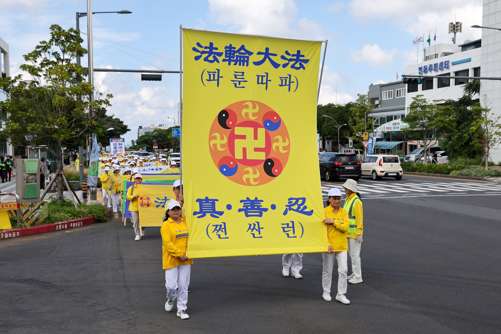 (Minghui.org) A parade to congratulate the 450 million Chinese who have withdrawn from the Chinese Communist Party (CCP) and its affiliated organizations was held on Jeju Island, South Korea, on September 21 and 22, 2025. Jeju Island is a favorite destination for Chinese tourists, offering visa-free entry and attracting a large number of visitors each year.