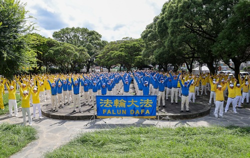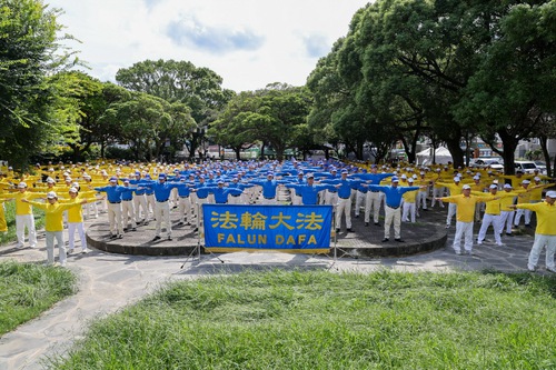 The event, hosted by the Falun Dafa Association of South Korea, was attended by practitioners from South Korea, Japan, Taiwan, Vietnam, and other countries. They did the exercises in Samda Park in Jeju City, followed by a stage performance and a parade along the main street lasting about 3 kilometers.