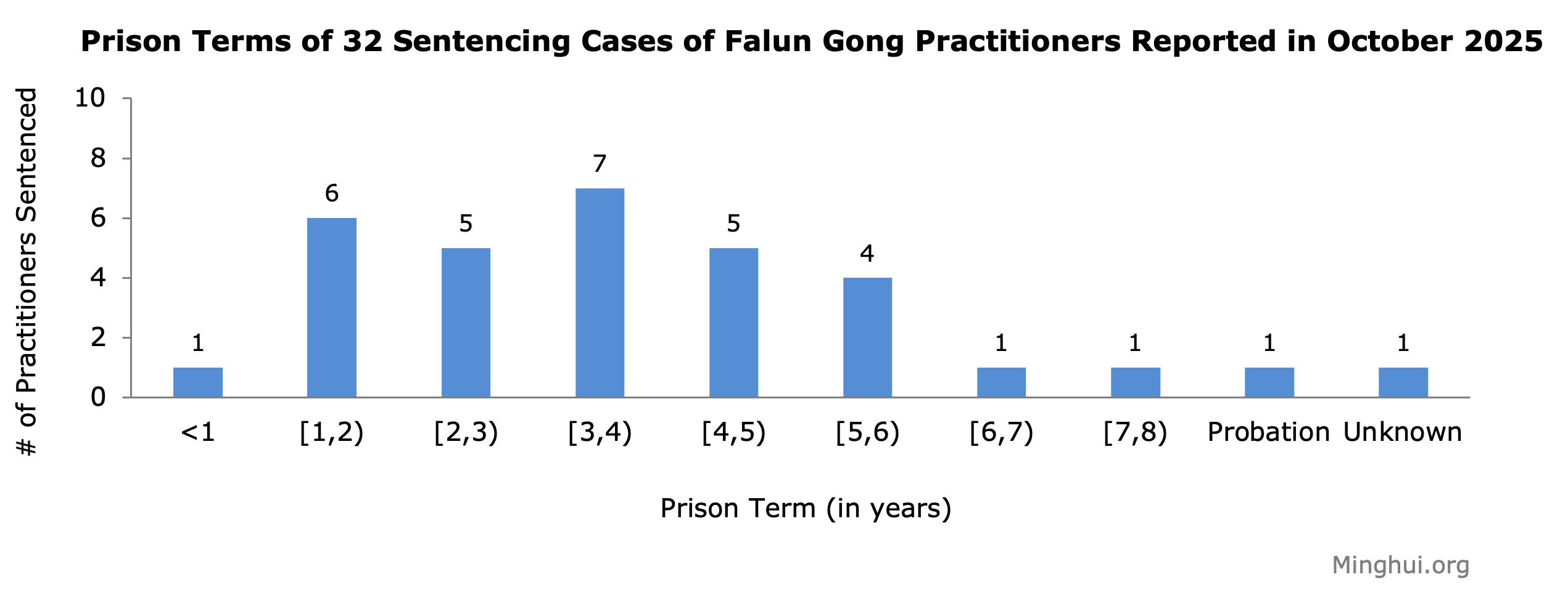 (Minghui.org) A total of 32 cases of Falun Gong practitioners sentenced to prison for their faith were reported in October 2025.