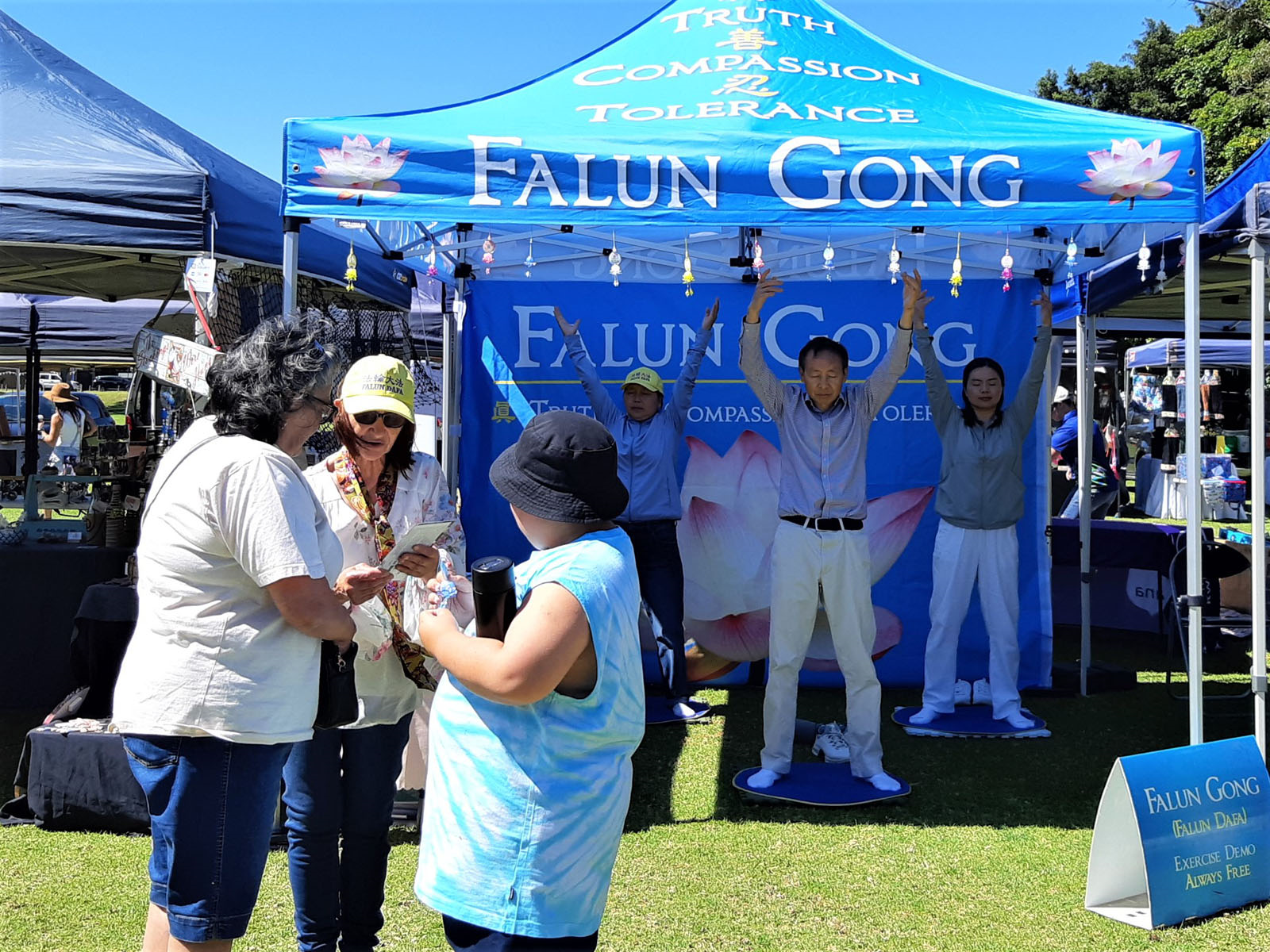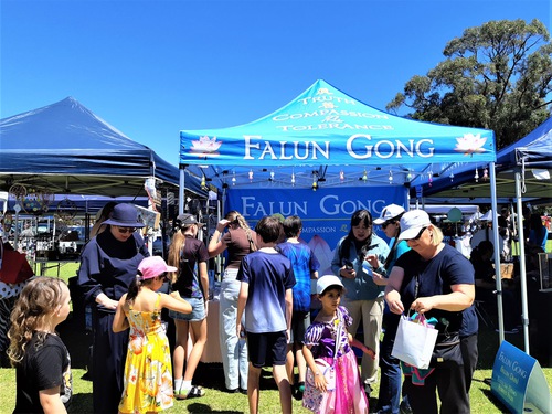 (Minghui.org) The annual Rotary Kwinana Community Fair was held in Calista, south of Perth, on November 8, 2025. There were over 100 booths. Falun Dafa practitioners set up a booth, which drew many visitors. Some people wished to learn the exercises right then.