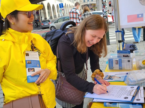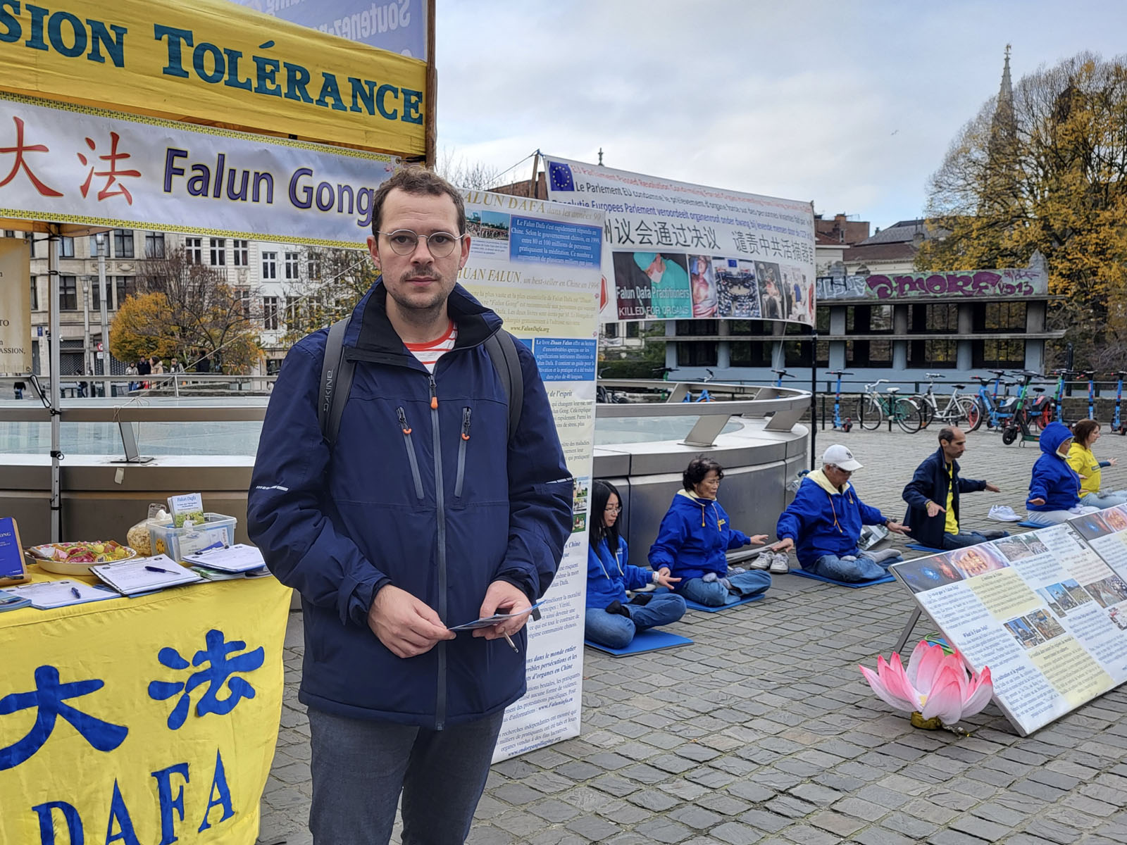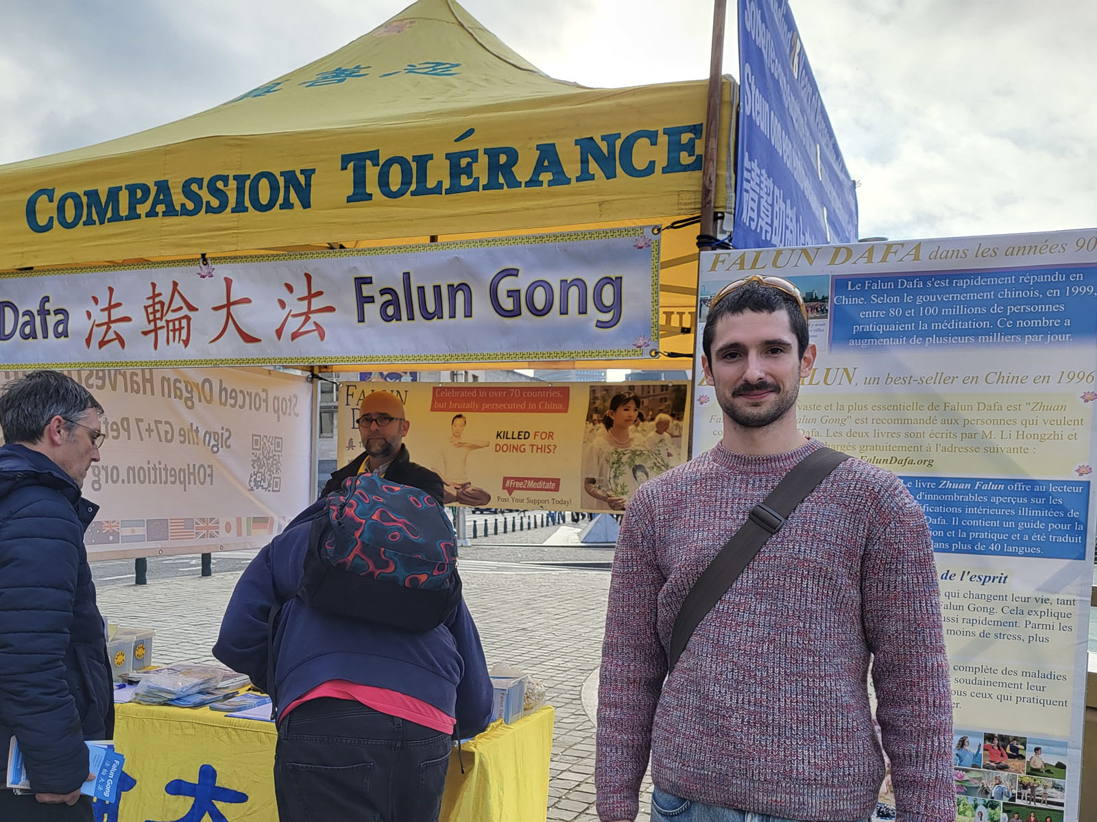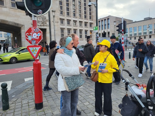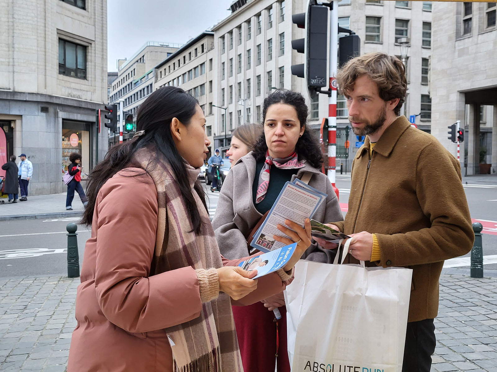 Marine works at the French Culture and International Exchange Association and talked with a practitioner for a long time. She and her friend were visiting Belgium that weekend, and this was the first time either of them had heard about the persecution. After she read the display board, Marine said she thought she should do something, like sign the petition. She said it was important to let more people know about the persecution. “I wish to learn more due to my work,” she said.