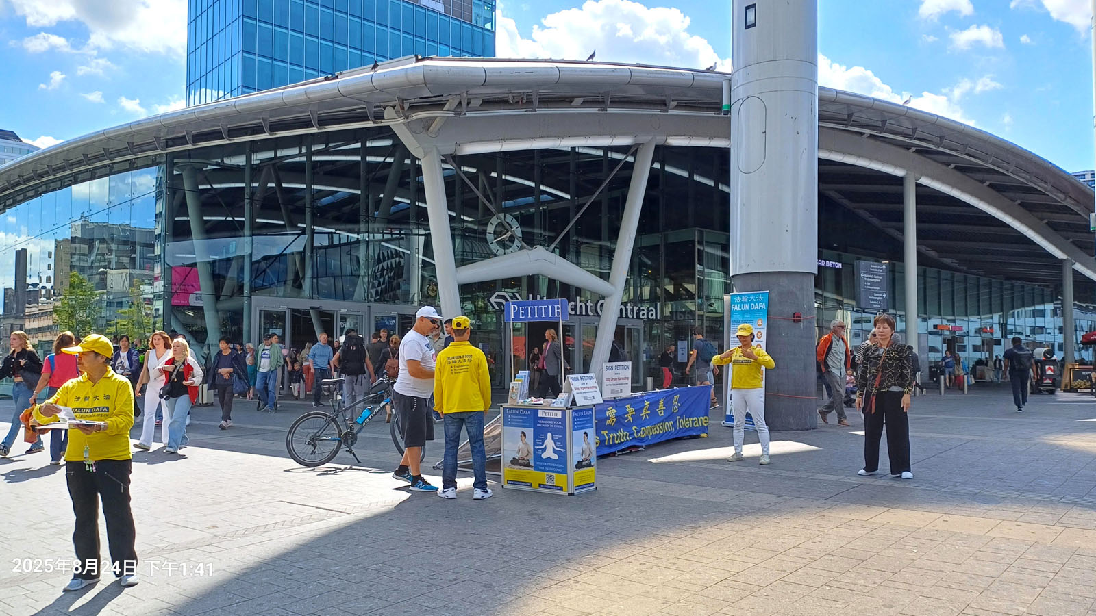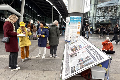 On October 26, 2025, Falun Dafa practitioners held an activity near the Utrecht Central Station to introduce Falun Dafa and raise awareness of the forced organ harvesting in China.