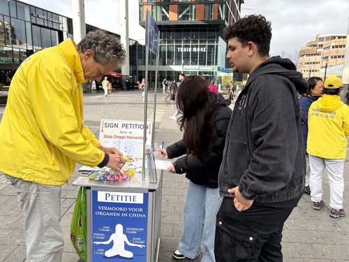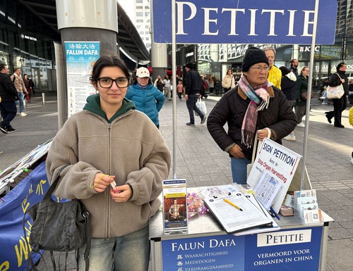 Irem Karasu is originally from Turkey and lives in Rotterdam. She stopped to read the practitioners’ large banner, which has detailed information about the persecution of Falun Dafa in China. After she learned more about the persecution she signed the petition and said she would share the petition with her relatives. “At least it encourages people with a conscience to take a look and pay attention,” she said.