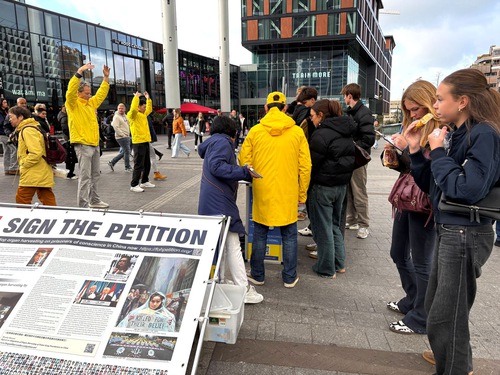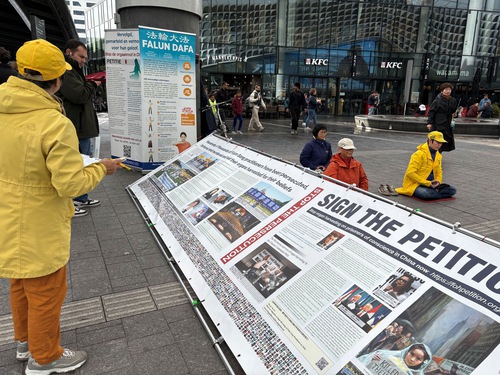 (Minghui.org) On October 26, 2025, Falun Dafa practitioners from different cities in the Netherlands held an activity near the Utrecht Central Station to tell the public about Falun Dafa and the forced organ harvesting of its practitioners in China. They set up an information booth with materials displaying the facts of the Chinese Communist Party’s (CCP) persecution. They did the Falun Dafa exercises, and collected signatures on a petition that calls on the G7+7 nations to take action to stop the CCP’s forced organ harvesting operations.