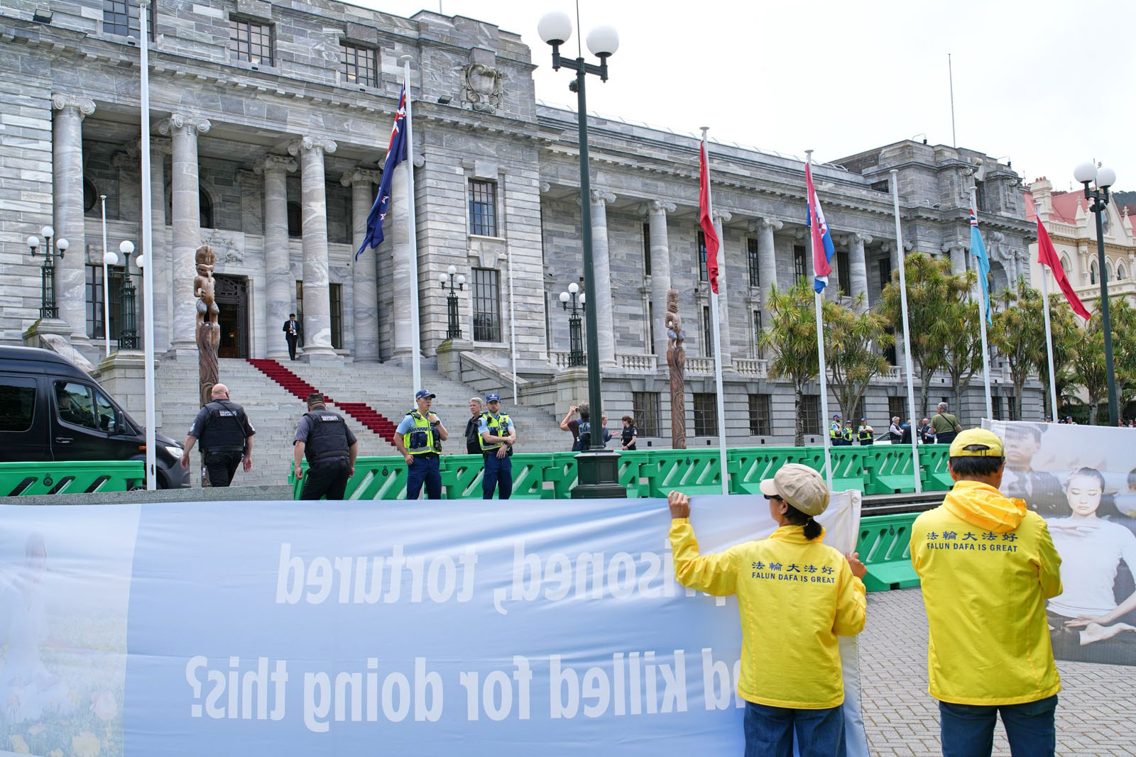 Falun Gong practitioners hold a peaceful protest in front of the New Zealand Parliament Building during Zhao Leji’s visit on November 20, 2025.