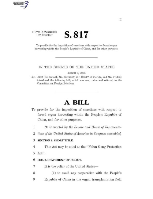 The Falun Gong Protection Act (S.817) was put forward by Senator Ted Cruz on March 3, 2025. The bill states that the Chinese Communist Party (CCP) still conducts forced organ harvesting from Falun Gong practitioners. The bill provides for sanctioning those involved in the forced organ harvesting.