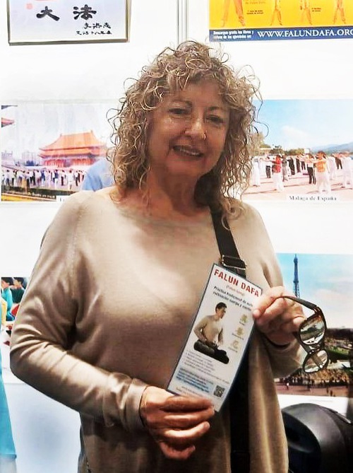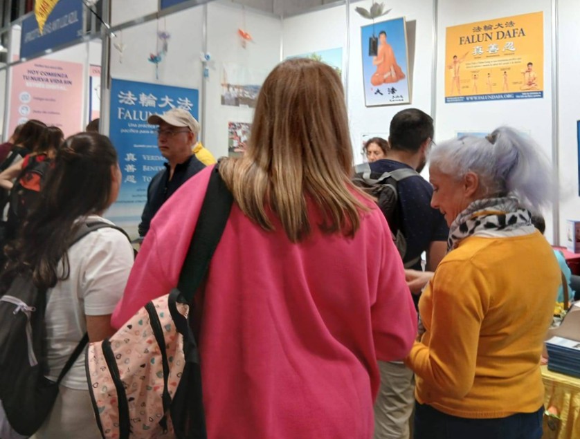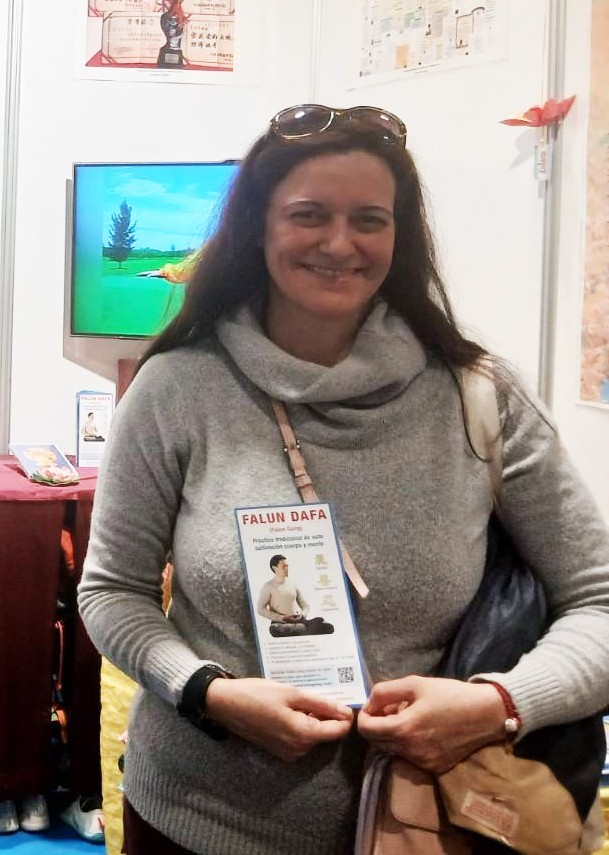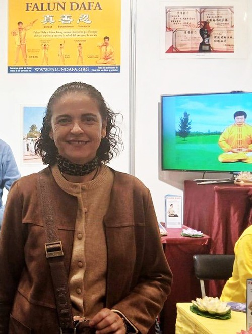 Sol Valcarcel, who worked at the exhibition, passed by practitioners’ booth frequently. She saw the exercise demonstration and the introduction to Falun Dafa on the television.