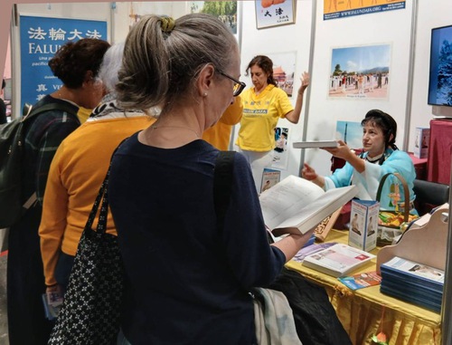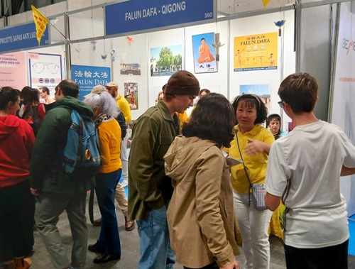 Practitioners’ booth featured a photograph of Falun Dafa’s founder Mr. Li Hongzhi, exercise-teaching videos, and posters that showed Falun Dafa being practiced worldwide. Practitioners also demonstrated the five Falun Dafa exercises with the music, which many visitors stopped to watch. Many people who wanted to learn more took materials, and some purchased Falun Dafa books. Several learned the exercises onsite.