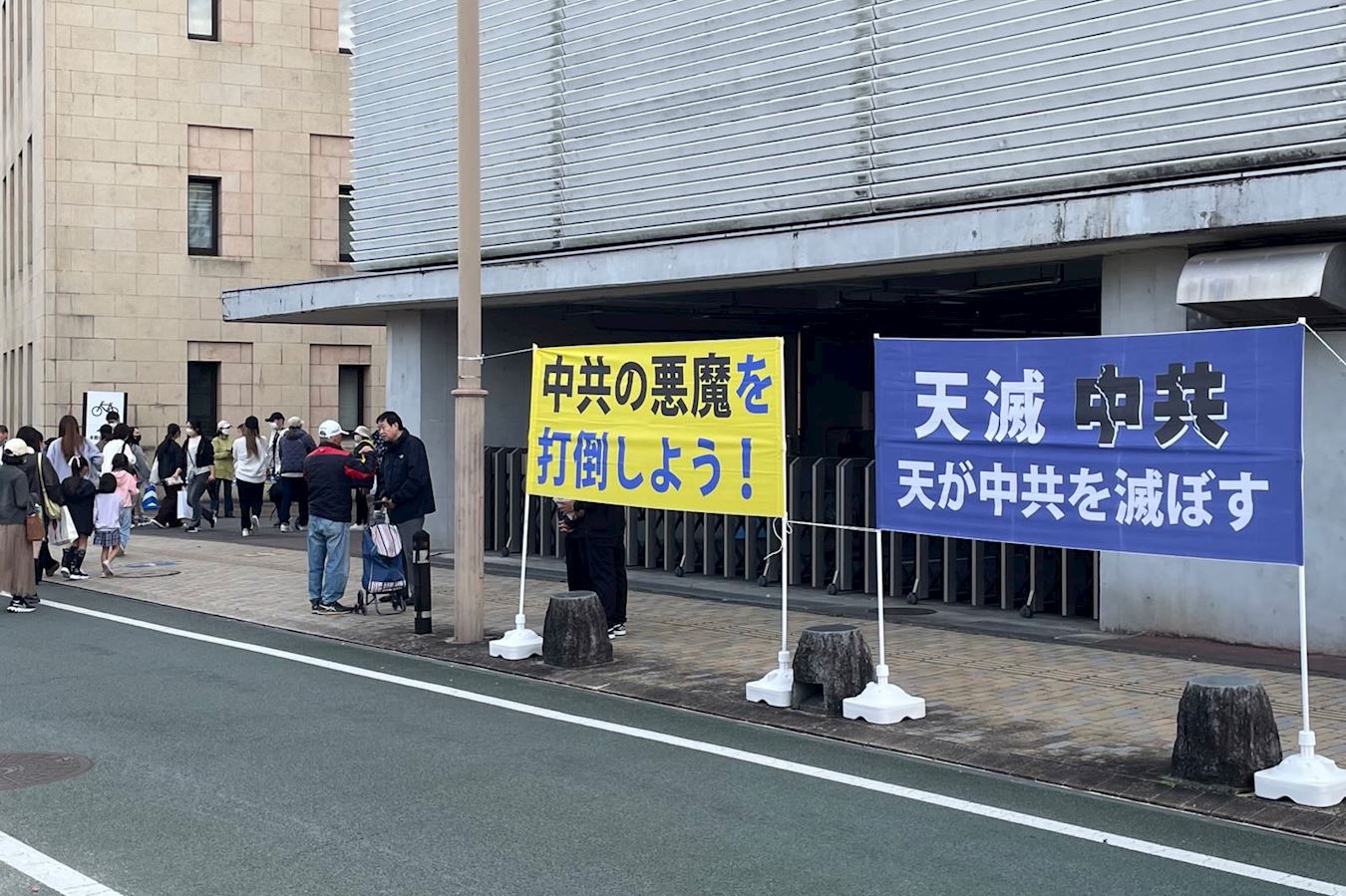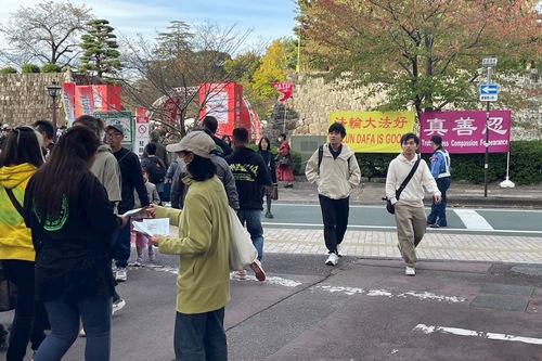 (Minghui.org) The largest street performing arts festival in Asia, the 32nd Daidogei World Cup, was held in Shizuoka from October 31 to November 3, 2025. Street performers from around the world flock to Japan to participate in the popular event. Falun Dafa practitioners distributed information about their spiritual practice and the persecution in China to residents and tourists.
