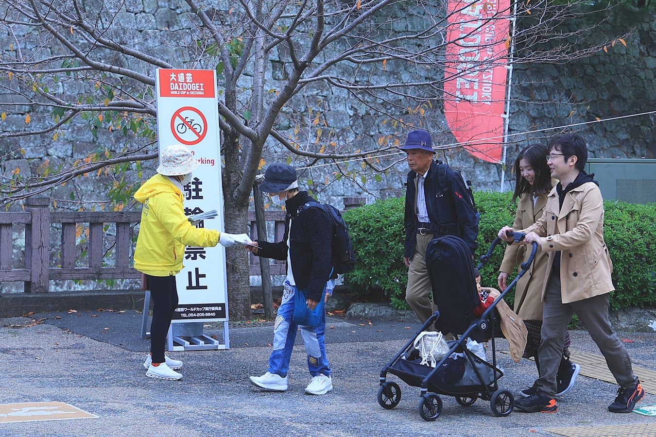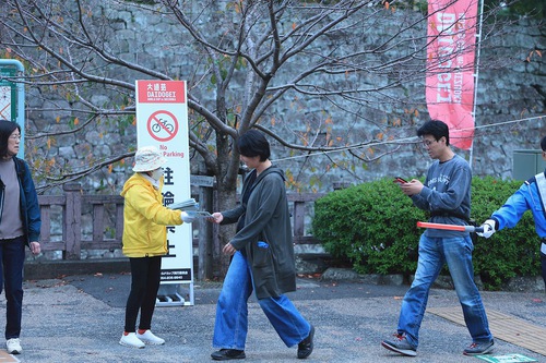 Distributing information about Falun Dafa near Sumpu Castle Park, the main venue of the Daidogei World Cup.
