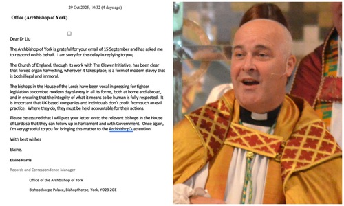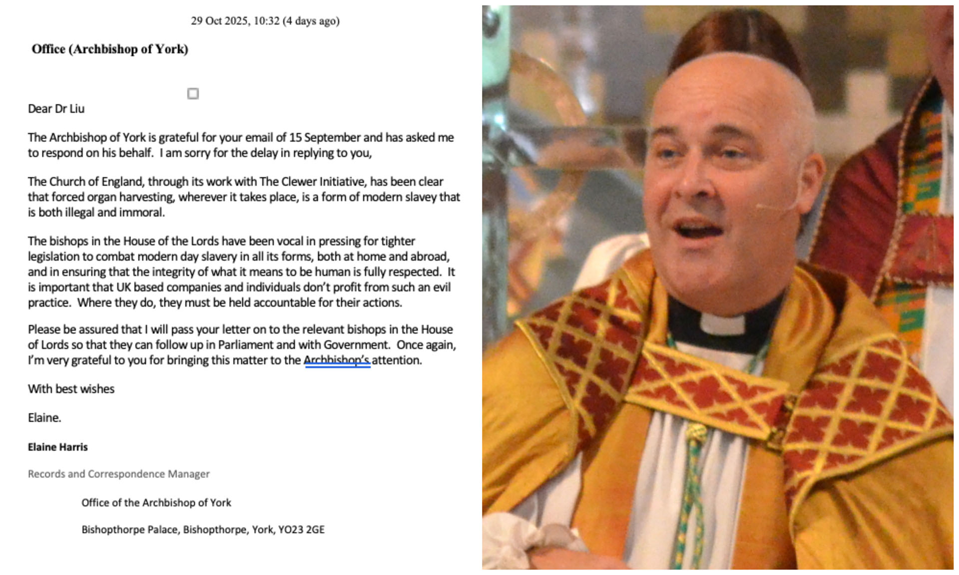 (Minghui.org) Elaine Harris from the office of The Archbishop of York Stephen Cottrell sent a letter on his behalf to the UK Falun Dafa Association on October 29, 2025. She wrote, “The Archbishop of York is grateful for your email of 15 September and has asked me to respond on his behalf.”