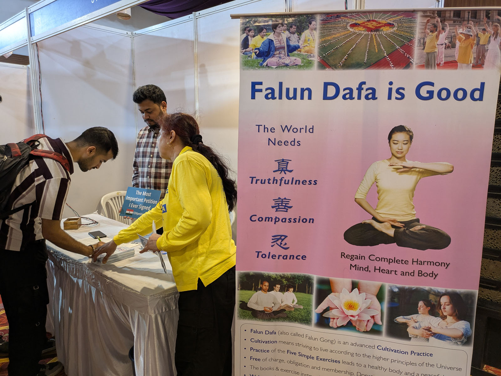 Visitors sign the DAFOH petition at the Falun Dafa booth during the Pune Book Fair.