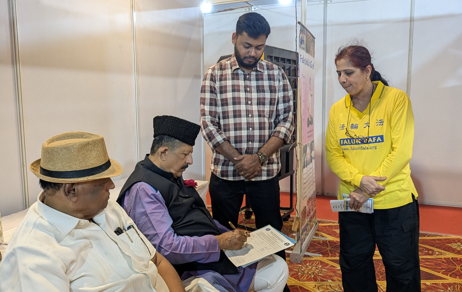 Vinayakrav Jadhav (in the black vest) learned about Falun Dafa from practitioners and signed the DAFOH petition.