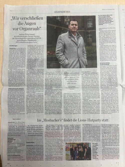 Westdeutsche Allgemeine Zeitung (WAZ) published a report: “We are turning a blind eye to organ harvesting” on December 10, 2025.