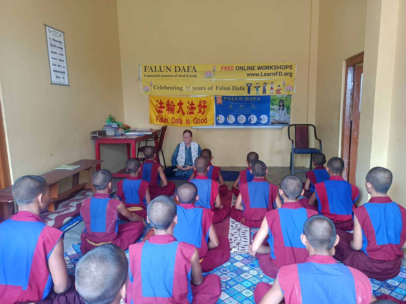 The students who attended came from a variety of backgrounds, including girls’ schools and colleges, children’s homes, special education schools, and a Tibetan school. They expressed their appreciation for the exercises and Falun Dafa’s values of Truthfulness, Compassion, and Forbearance. The practitioner also received help from locals who are supportive of the effort to spread Falun Dafa.