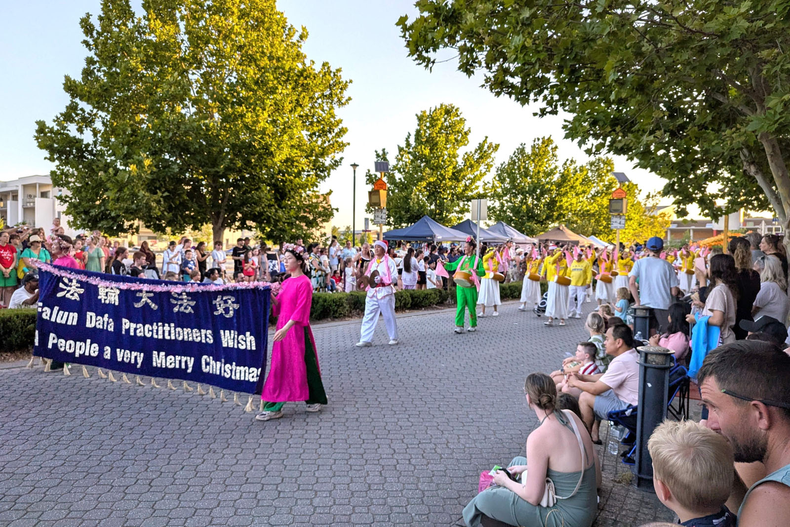 Practitioners had a booth at the Christmas festival in Ellenbrook, Perth, on Saturday, December 13, 2025. They introduced the physical and mental benefits of practicing Falun Dafa to passersby and demonstrated the exercises. Later that evening they participated in a parade and celebrated the holidays with local residents.