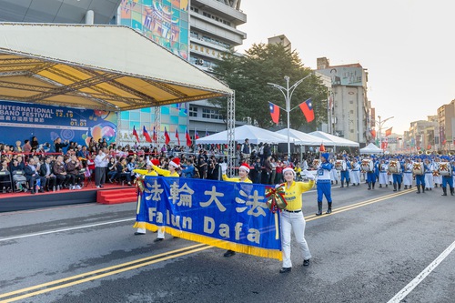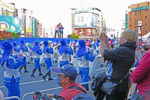 The Tian Guo Marching Band is made up of over 200 Falun Dafa practitioners spanning three generations—elderly, middle-aged and young—and even included practitioners from Japan. They were greeted by cheers as the band marched along Zhongshan Road from Fountain Circle in central Chiayi to Kano Park along the nearly 3-km (almost 2-mile) parade route. The band performed several songs including “Falun Dafa Is Great,” combining their sacred and pure music with synchronized steps, sharing the beauty of Falun Dafa with the festival attendees.