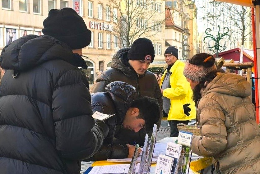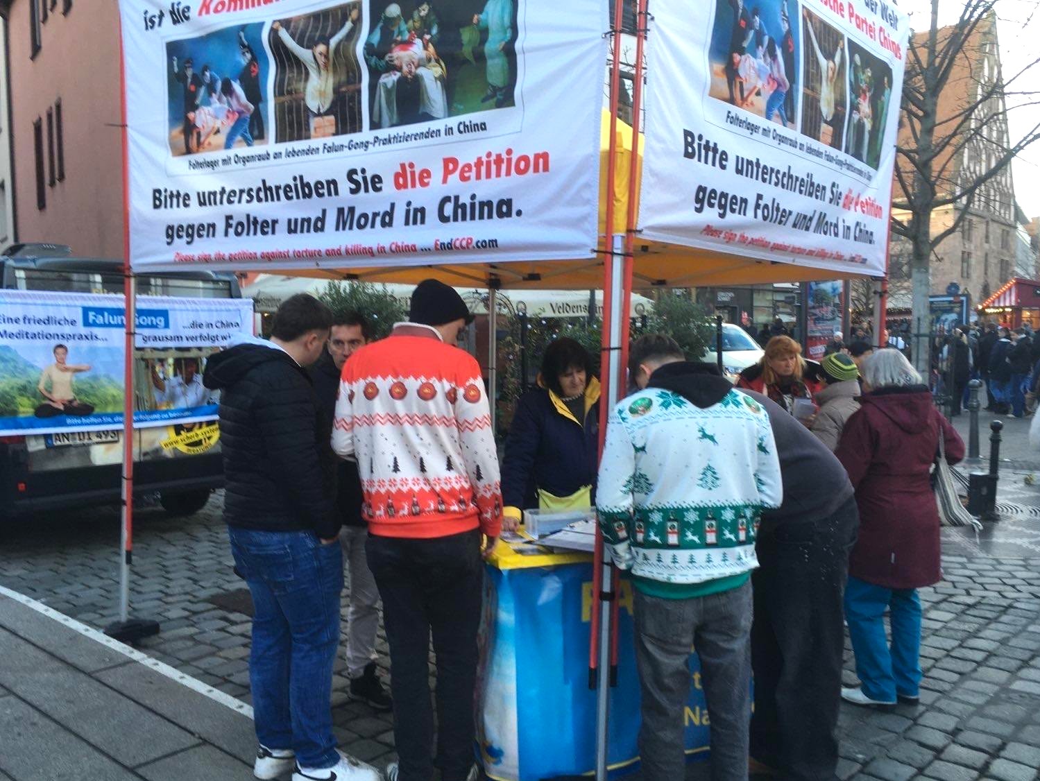 It was the last weekend before Christmas, so the renowned Nuremberg Christmas Market was filled with tourists. Many people signed the petition calling for an end to the CCP’s persecution and encouraged practitioners to persist in their efforts.