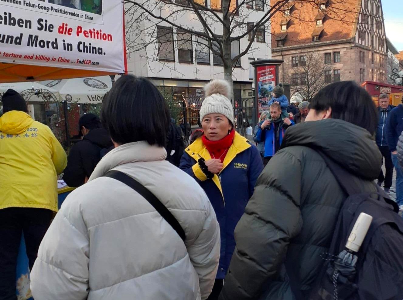 (Minghui.org) Practitioners in Nuremberg held a vigil at the Christmas Market in the center of the city on December 20, 2025. They introduced Falun Dafa (also known as Falun Gong) and raised awareness of the Chinese Communist Party’s (CCP) persecution.