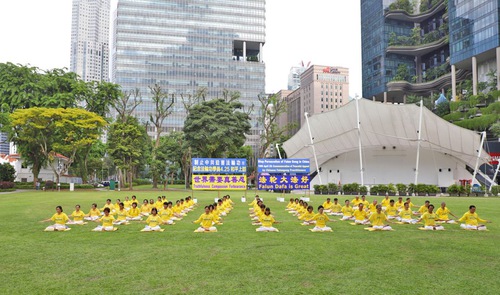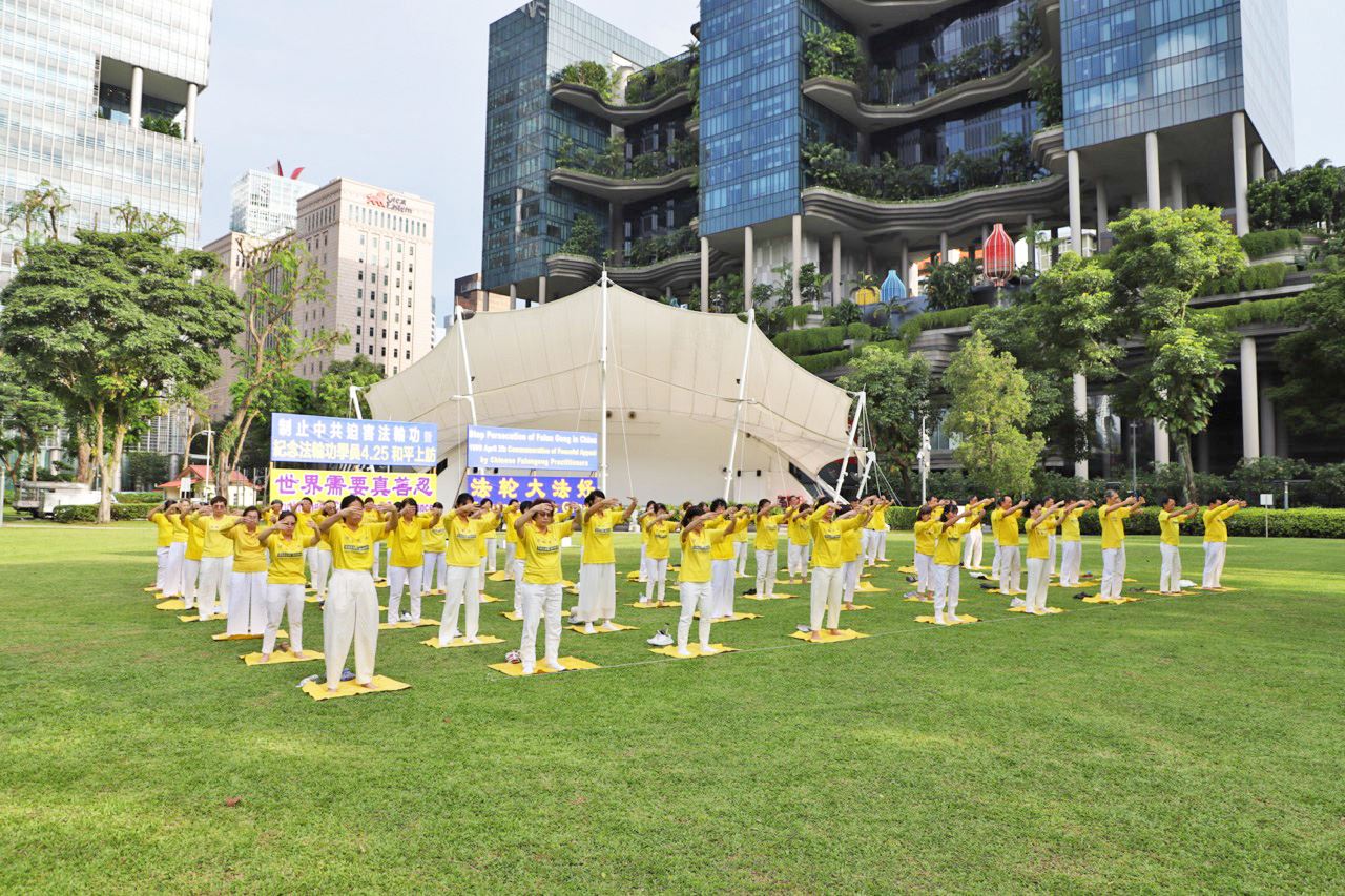 (Minghui.org) Practitioners gathered at Hong Lim Park on the afternoon of April 22 for group exercises to commemorate the April 25 peaceful appeal in Beijing 26 years ago.