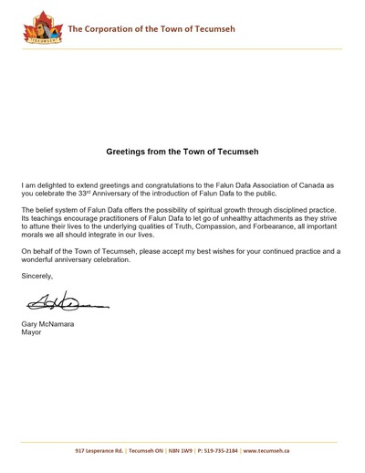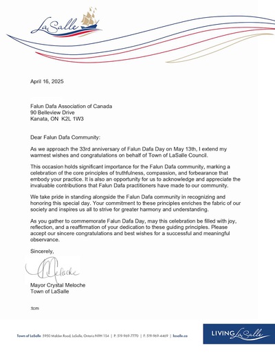 As we approach the 33rd anniversary of Falun Dafa day on May 13th, I extend my warmest wishes and congratulations on behalf of Town of LaSalle Council.