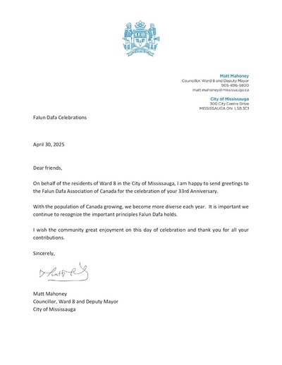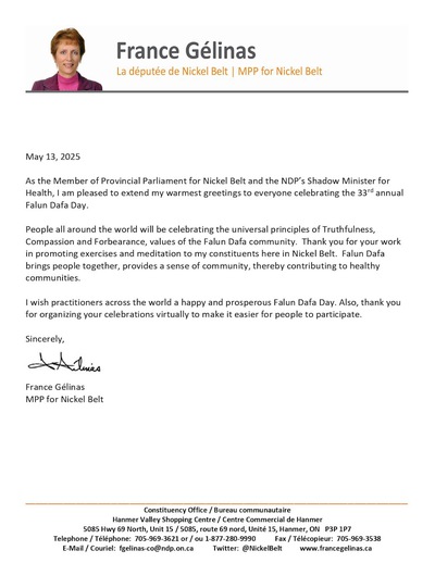 (Minghui.org) May 13, 2025 is the 33rd anniversary of the public introduction of Falun Dafa and the 26th World Falun Dafa day. Elected officials from all three levels of government in Canada sent letters celebrating the occasion and praising the benefits that Falun Dafa brings to their communities through the universal principles Truthfulness-Compassion-Forbearance. Below are the congratulatory letters from 15 elected officials in Ontario received to date.