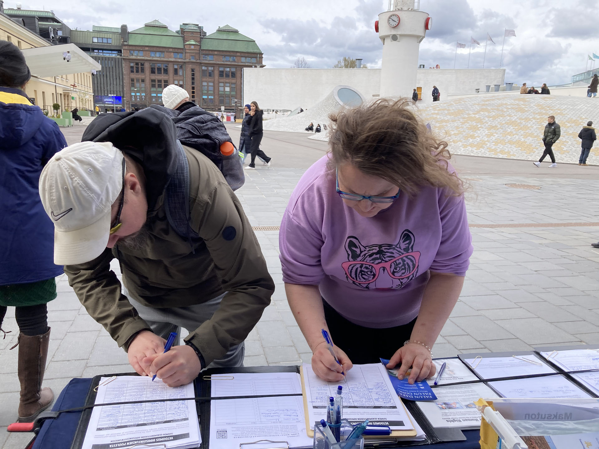 Reijo is a retired Finnish man who came alone to the city center square, and was drawn from afar by the Falun Dafa practitioners’ activities. He walked over and carefully read the information boards about the petition campaign. After learning the truth, Reijo asked the practitioners with a serious expression, “How many petition forms do you have?” He hoped that each one could be signed with his name. He stated that as a conscientious citizen, it is his duty to support justice through action.