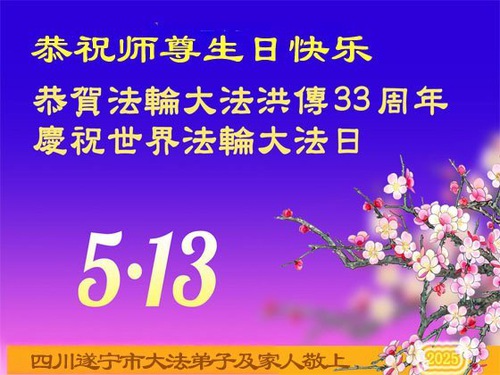 (Minghui.org) May 13, 2025, marks the 26th World Falun Dafa Day and the 33rd anniversary of the public introduction of Falun Dafa. The day is also the birthday of Master Li, the founder of Falun Dafa. Practitioners around the world are sending their heartfelt greetings to celebrate this grand occasion and honor revered Master on this special day.