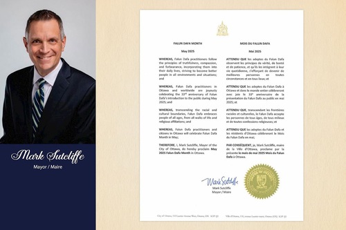 The Honorable Mark Sutcliffe, Mayor of Ottawa, proclaimed May 2025, “Falun Dafa Month.”