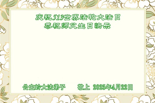 (Minghui.org) May 13, 2025, marks the 26th World Falun Dafa Day and the 33rd anniversary of the public introduction of Falun Dafa. This day is also the birthday of Master Li Hongzhi, the founder of Falun Dafa. Practitioners around the world are sending their heartfelt greetings to celebrate this grand occasion and honor revered Master on this special day.
