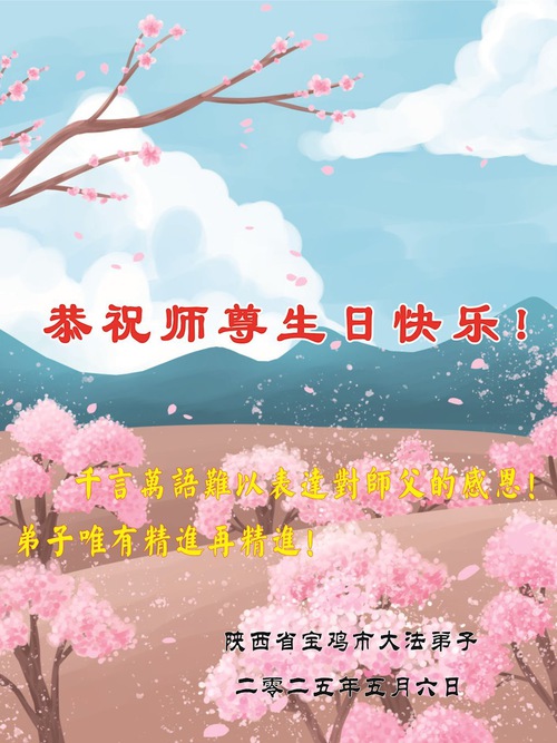 (Minghui.org) May 13, 2025, marks the 26th World Falun Dafa Day and the 33rd anniversary of the public introduction of Falun Dafa. The day is also the birthday of Master Li Hongzhi, the founder of Falun Dafa. Practitioners around the world are sending their heartfelt greetings to celebrate this grand occasion and honor revered Master on this special day.