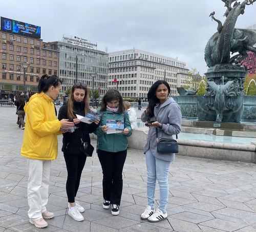 A young man from Denmark took a Falun Dafa leaflet and saw that a practitioner was holding the Chinese version of The Epoch Times newspaper and small Chinese truth-clarifying booklets in her hand. The first page of the newspaper displayed Master Li Hongzhi’s lecture How Humankind Came To Be, and he said he really wanted to read it. He took out his mobile phone to scan that page, and it was immediately translated into English. He read the English version of Master’s article. He said he would read the newspaper and the booklet.