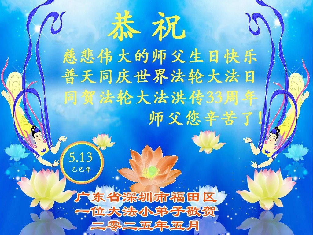 (Minghui.org) May 13, 2025, marks the 26th World Falun Dafa Day and the 33rd anniversary of the public introduction of Falun Dafa. The day is also the birthday of Master Li, the founder of Falun Dafa. Practitioners around the world send their heartfelt greetings to celebrate this grand occasion and honor revered Master on this special day.