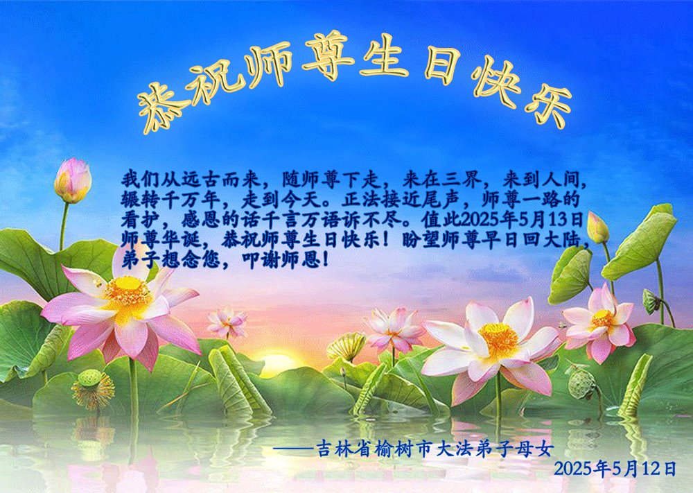 (Minghui.org) May 13, 2025, marks the 26th World Falun Dafa Day and the 33rd anniversary of the public introduction of Falun Dafa. The day is also the birthday of Master Li Hongzhi, the founder of Falun Dafa. Practitioners around the world convey their heartfelt greetings to celebrate this grand occasion and honor revered Master on this special day.