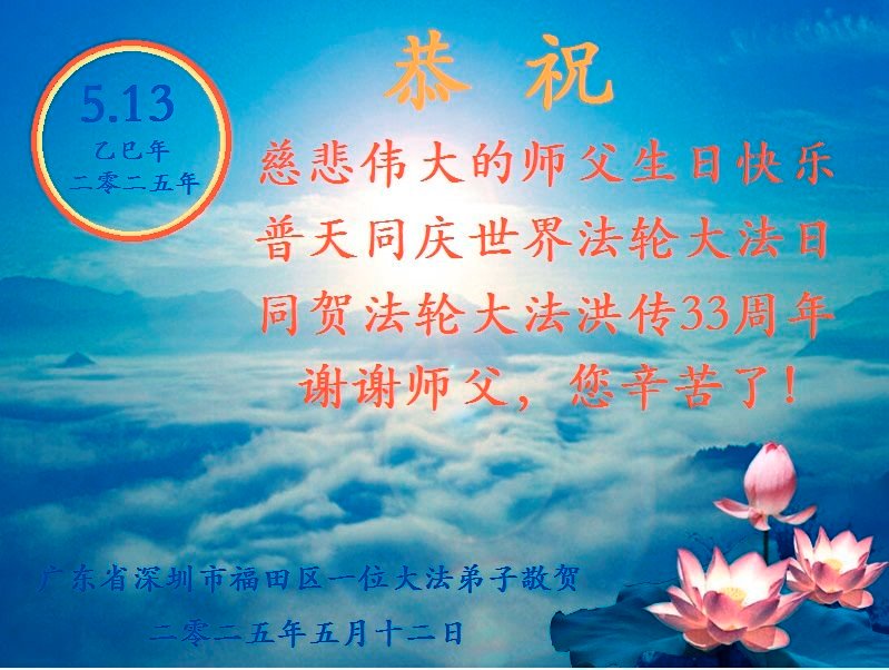 (Minghui.org) May 13, 2025, marks the 26th World Falun Dafa Day and the 33rd anniversary of the public introduction of Falun Dafa. The day is also the birthday of Master Li Hongzhi, the founder of Falun Dafa. Practitioners around the world convey their heartfelt greetings to celebrate this grand occasion and honor revered Master on this special day.