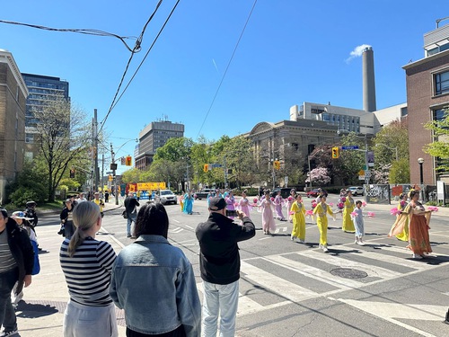 (Minghui.org) Falun Dafa practitioners in Toronto, Canada, gathered at the city center on May 11, 2025, and held a grand parade to celebrate World Falun Dafa Day. The parade included the Tian Guo Marching Band, heavenly maidens, exercise group, waist drum team, etc. It started from Grange Park, passed through Chinatown, the Art Gallery of Ontario, Eaton Center, and other popular attractions. Practitioners carried banners with messages to convey their gratitude to their founder, Master Li Hongzhi, to wish him a happy birthday, and tell people how wonderful Falun Dafa is.