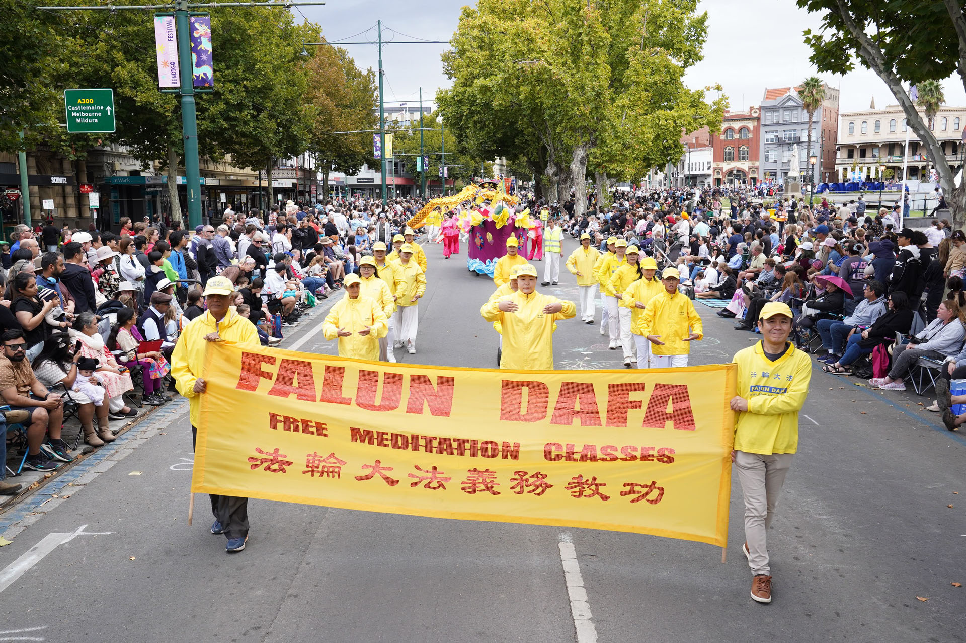 (Minghui.org) Practitioners participated in the annual Bendigo Easter Fair parade on April 20, 2025. Bendigo is the fourth largest city in Victoria State and has a rich cultural heritage. The Bendigo Easter Fair started in 1817 and is one of the oldest community fairs in Australia. The celebration lasts four days over the Easter long weekend. The parade draws many families from Melbourne and surrounding cities, as well as overseas tourists, every year.