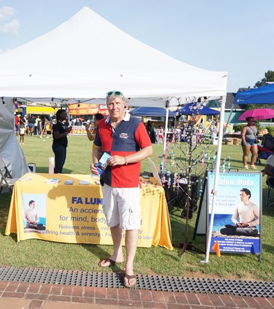 Mayor John Lampl stopped by the Falun Dafa booth and said Morrow is a diverse and vibrant community that welcomes everyone. About meditation he said its great to calm down and take a mental break. About Falun Dafa’s principles, Truthfulness-Compassion-Forbearance, Mayor Lampl said it’s great to find spiritual inspiration through beliefs, something every individual should strive to achieve. “We all make mistakes. No one is perfect. But it’s great to compare yourself to these three words when you get up in the morning and want to do better.”